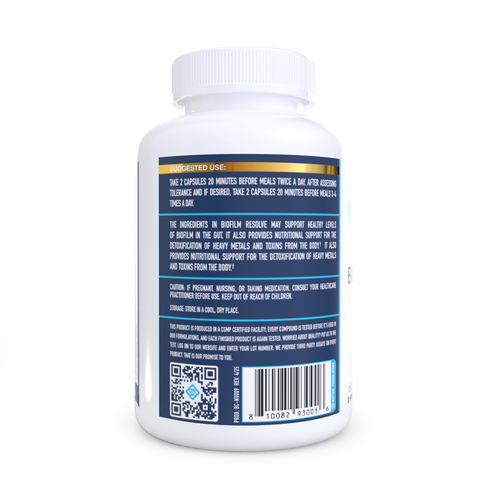 The ingredients in Biofilm Resolve have been clinically researched to promote healthy levels of biofilm in the human body.† Biofilm Resolve may help with common gastrointestinal concerns by supporting healthy levels of biofilm in the gut.† It also provides nutritional support for the detoxification of heavy metals and toxins from the body.†