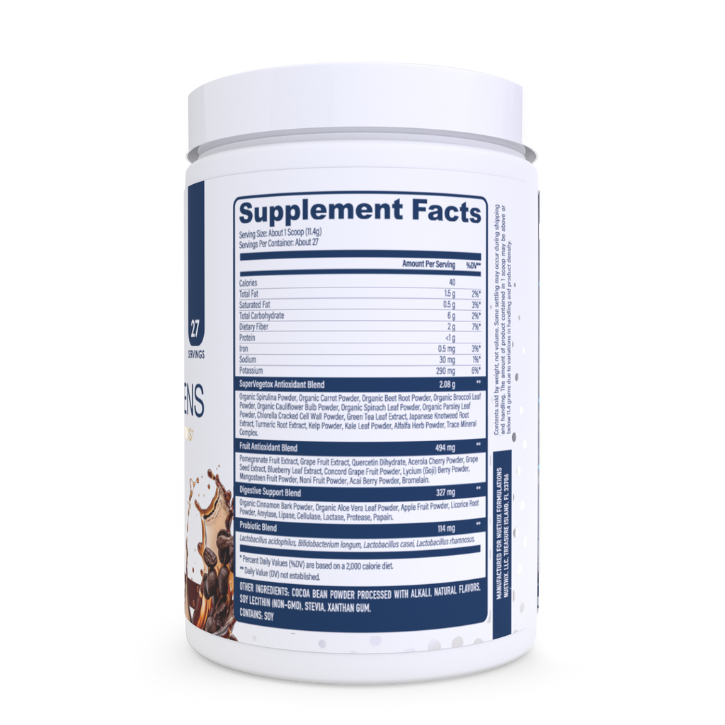 Gourmet Greens is a daily drink with antioxidant power of 20+ servings of fruits & veggies! It is an easy-to-mix, great tasting, nutrient-rich superfood formula with whole food concentrates designed to provide synergistic phytonutrient nutrition. It provides a super blend of 100% natural fruit and vegetable extracts, vitamins, enzymes, and symbiotic intestinal flora— high in antioxidants, lignans, and phytonutrients. The best tasting greens formula on the market. *