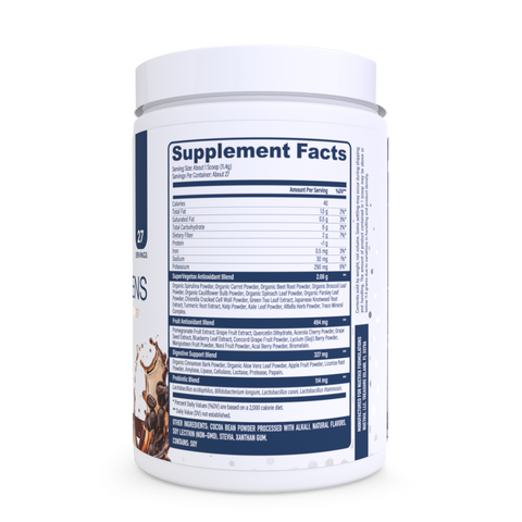 Organic Spirulina Powder, Organic Carrot Root Powder, Organic Broccoli Leaf Powder, Organic Cauliflower Bulb Powder, Organic Spinach Leaf Powder, Organic Parsley Leaf Powder, Chlorella Cracked Cell Wall Powder, Green Tea Leaf Extract, Japanese Knotweed Root Extract, Turmeric Root Extract, Organic Beet Root Powder, Kelp Powder, Kale Leaf Powder, Alfalfa Herb Powder, Alfalfa Concentrace® (Trace Mineral Complex)