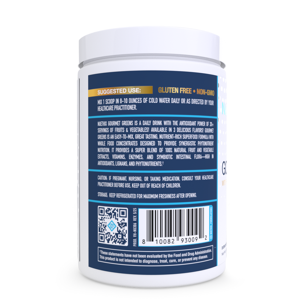 Gourmet Greens supports the body’s natural energy, metabolism, fat-burning, digestion, detoxification, immunity, repair, recovery, revitalization, and longevity.