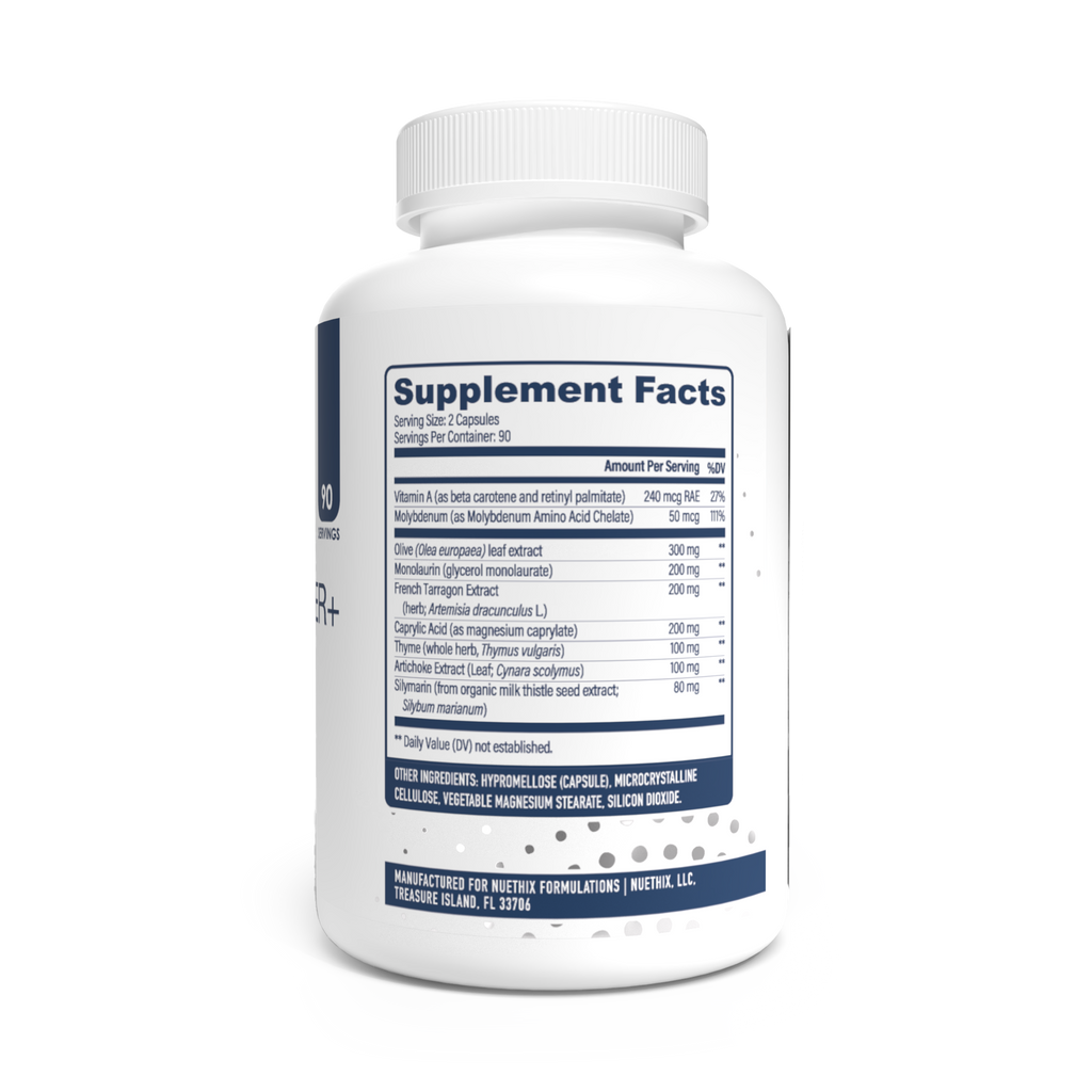 Gut Defender is loaded with natural herbs and acids that are clinically shown to kill bad bacteria but leave most your good bacterial intact. These rare herb extracts from French Tarragon, Thyme, and Olive leaf are effective killers but also easy on the gut lining. Most bacterial killers cause nausea and many other symptoms with their harsh herbal blends that overwhelm the liver. We’ve solved that issue with potent liver blend of silymarin, artichoke extract, and NAC to clean out LPS for optimal liver detoxification. Before Gut Defender + this would take many products, but Nuethix has made this a one product solution. The key to vitality is a clean gut. Gut Defender + is your one product solution!