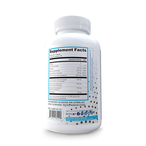 In support is Boswellia and Curcumin, both known to exceptionally reduce bodily inflammation. Rounding out this formula are Collagen and Rice Protein Matrix Polyphenols, backed by published research in the treatment of rheumatoid arthritis and osteoarthritis.*