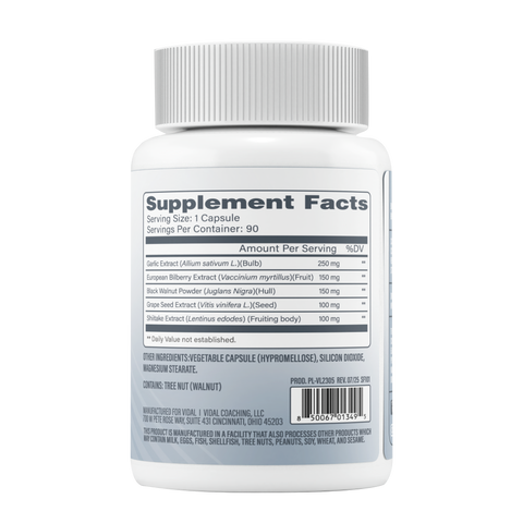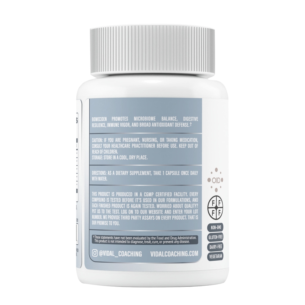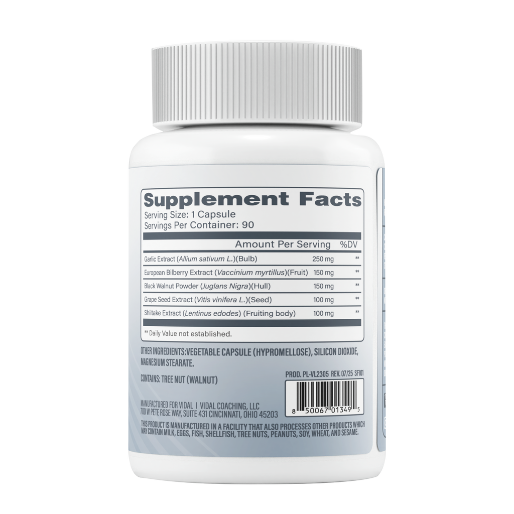 Unleash the power of nature with VidalRx BiomeCiden, a premium botanical blend designed to support your immune system, promote cardiovascular health, and help maintain balanced digestion. Featuring potent Garlic Extract (Allium sativum L.), this formula brings centuries of traditional wellness wisdom into a modern, easy-to-take capsule.